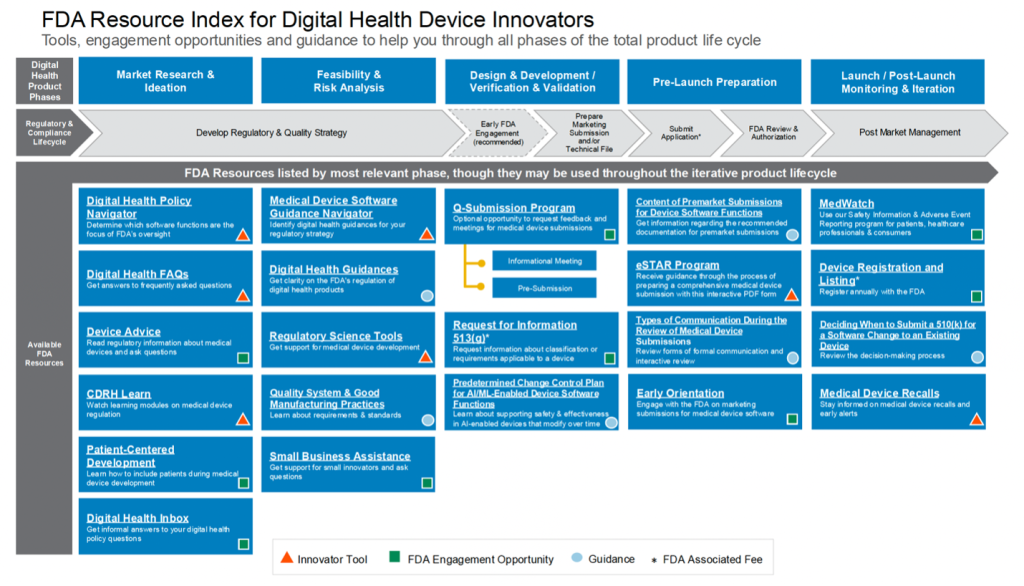The Resource Index for Innovators is a visual, stepwise guide to core FDA tools, engagement opportunities, and relevant guidance documents mapped across the device development and compliance lifecycle. The Index notes six (6) free opportunities for pre-launch FDA engagement as well as the three (3) steps associated with an FDA fee: the 513(g) Request for Medical Device Designation, Application Submission, and Device Listing and Registration.